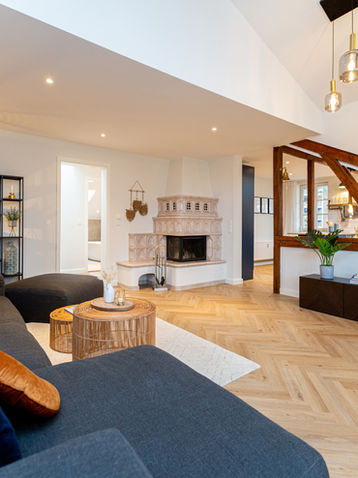 Die Villa Brunnenstraße liegt sehr nah am Meer. Die Wohnung 03 war in die Jahre gekommen und hatte Platz für bis zu 6 Personen, jedoch nur ein Badezimmer. Uns bot sich demnach die Gelegenheit, eine modern-maritime Wohlfühloase zu schaffen und aus einem Bad zwei Bäder zu machen. Die Wohnung verfügt über einen sehr geräumigen Wohn- Essbereich mit einer offenen Küche, die mit wunderschönen alten Balken optisch vom Wohn- Essbereich getrennt ist. Die Raumaufteilung wurde hier so verändert, dass das gemütliche Sofa sich zur Kommunikation in Richtung Küche, für Filmeabende in Richtung Fernseher und für entspannte Kaminabende in Richtung Kamin orientiert. So wurde der Raum zu einem Familienmittelpunkt, der jedem Besucher und jeder Aktion gerecht wird. Am Esstisch kann gegessen oder Spiele gespielt werden. Auf dem Sofa kann man es sich so richtig gemütlich machen und wer kochen möchte, ist stets beim Geschehen mit dabei. Aus einem übergroßen Badezimmer wurde ein stilvolles Wannenbad mit freistehender Badewanne und ein Duschbad mit moderner Glasdusche. Mit zwei Vollbädern wurde so auch die Nutzbarkeit der Wohhnung für bis zu 6 Personen optimiert. Gleich von Beginn an, erreichten uns begeisterte Rückmeldungen über die familienfreundliche Nutzbarkeit der Wohnung. Die Auslastung konnte gesteigert werden und Besucher kommen gern wieder.